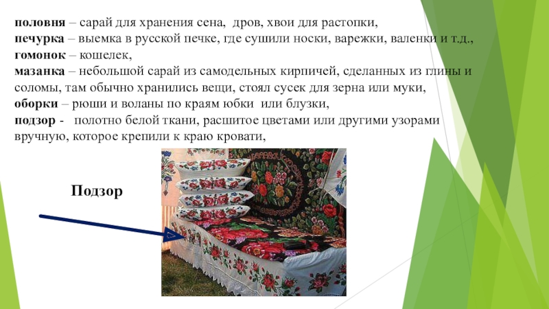 подзор - полотно белой ткани, расшитое цветами или другими узорами вручную, которое крепили к краю кровати,