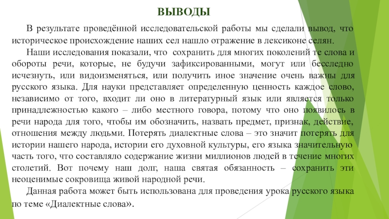 Наши исследования показали, что сохранить для многих поколений те слова и обороты речи, которые, не будучи зафиксированными, могут или бесследно исчезнуть, или видоизменяться, или получить иное значение очень важны для русского языка. Для науки представляет определенную ценность каждое слово, независимо от того, входит ли оно в литературный язык или является только принадлежностью какого – либо местного говора, потому что оно появилось в речи народа для того, чтобы им обозначить, назвать предмет, признак, действие, отношения между людьми. Потерять диалектные слова – это значит потерять для истории нашего народа, истории его духовной культуры, его языка значительную часть того, что составляло содержание жизни миллионов людей в течение многих столетий. Вот почему наш долг, наша святая обязанность – сохранить эти неоценимые сокровища живой народной речи.