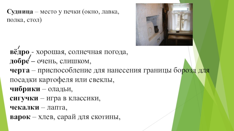 Слайд 17Судница – место у печки (окно, лавка, полка, стол)