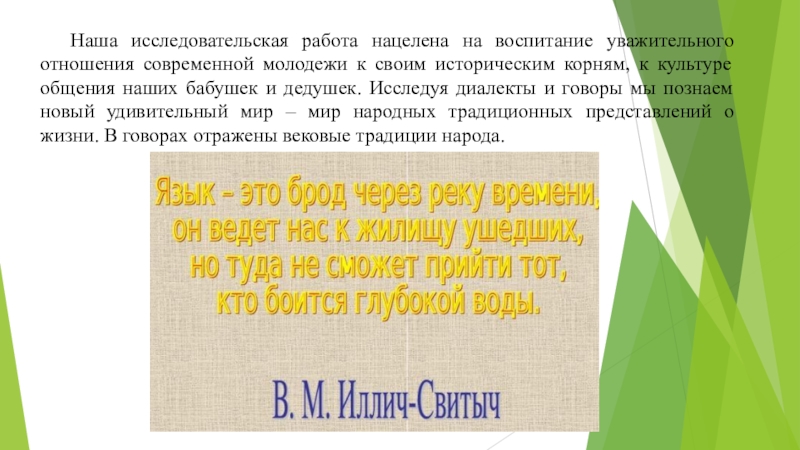 своим историческим корням, к культуре общения наших бабушек и дедушек. Исследуя диалекты и говоры мы познаем новый удивительный мир – мир народных традиционных представлений о жизни. В говорах отражены вековые традиции народа.