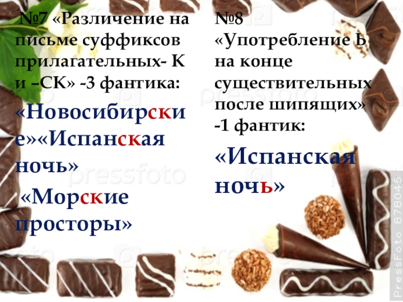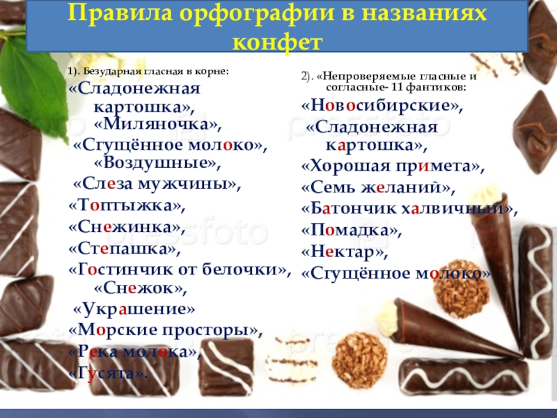 1 Классифицировать названия конфет по видам орфограмм.