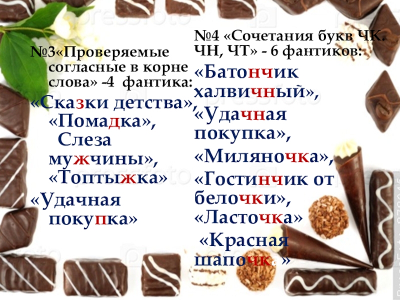 2. Повторить найденные орфограммы в названии фантиков от конфет.
