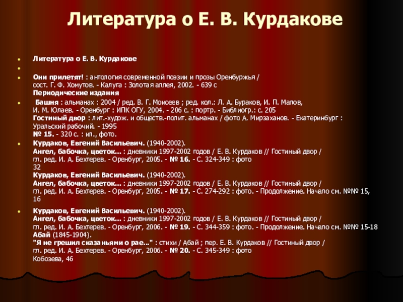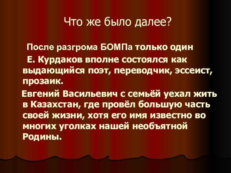 вклад в литературу конца XX и начало XXI века, талантливейший поэт и эссеист. Е.В.Курдаков - автор замечательных стихов и прозы. И этот человек с большой буквы связан линиями судьбы с Бузулуком. Именно здесь он начинал работать как писатель, и наш город стал для него началом его творческого пути. Это не может не послужить предметом гордости для всех бузулучан.