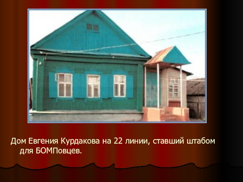 Слайд 8Дом Евгения Курдакова на 22 линии, ставший штабом для БОМПовцев.