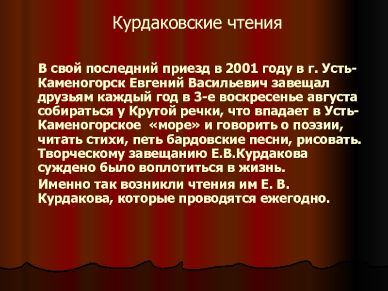 в г. Усть-Каменогорск Евгений Васильевич завещал друзьям каждый год в 3-е воскресенье августа собираться у Крутой речки, что впадает в Усть-Каменогорское «море» и говорить о поэзии, читать стихи, петь бардовские песни, рисовать. Творческому завещанию Е.В.Курдакова суждено было воплотиться в жизнь.