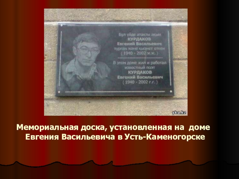 Слайд 11Мемориальная доска, установленная на доме Евгения Васильевича в Усть-Каменогорске