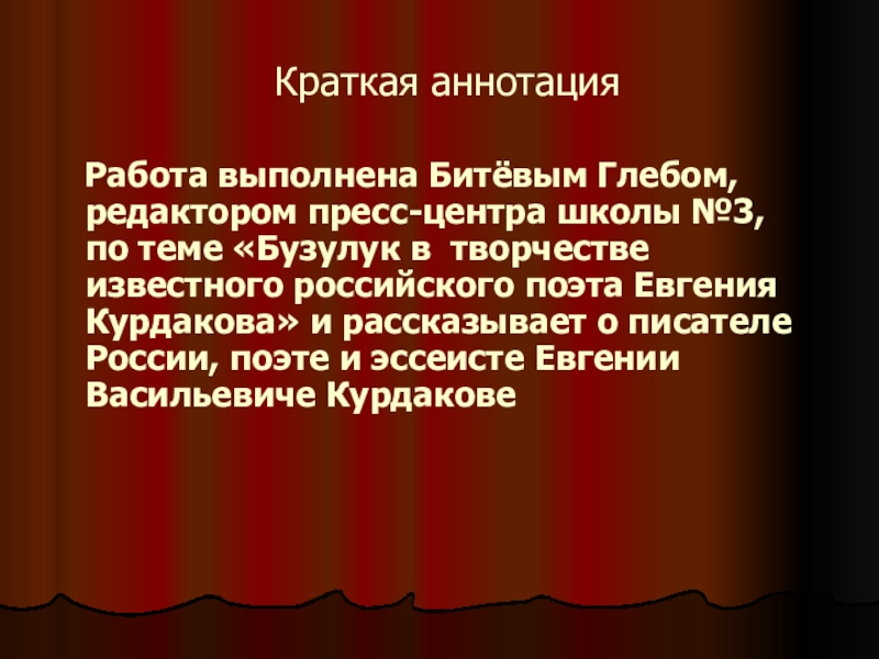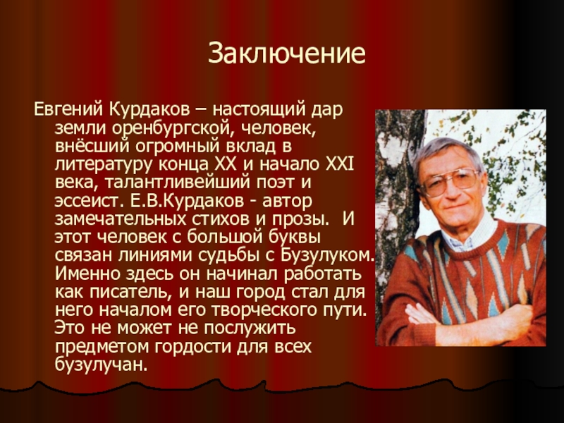 по теме «Бузулук в творчестве известного российского поэта Евгения Курдакова» и рассказывает о писателе России, поэте и эссеисте Евгении Васильевиче Курдакове