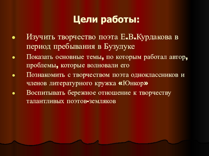 Изучить творчество поэта Е.В.Курдакова в период пребывания в Бузулуке