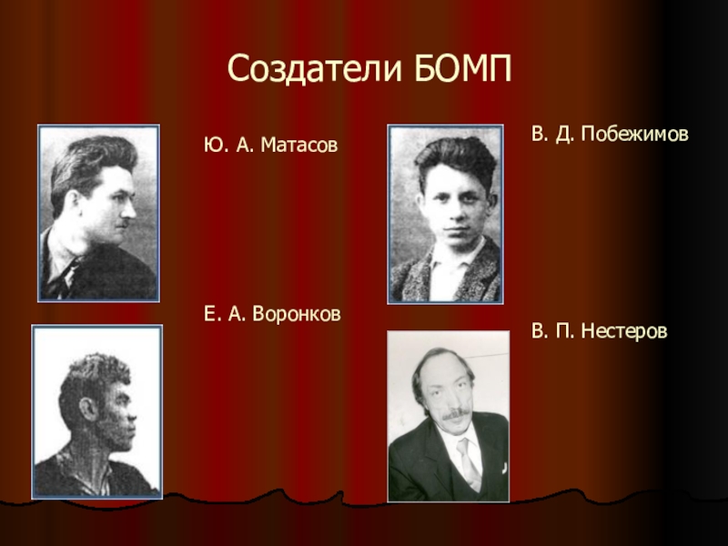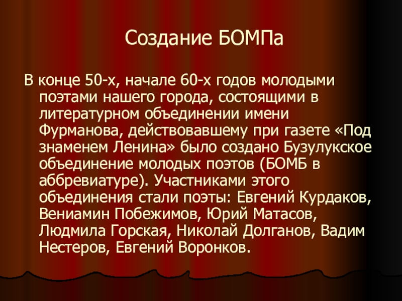 состоящими в литературном объединении имени Фурманова, действовавшему при газете «Под знаменем Ленина» было создано Бузулукское объединение молодых поэтов (БОМБ в аббревиатуре). Участниками этого объединения стали поэты: Евгений Курдаков, Вениамин Побежимов, Юрий Матасов, Людмила Горская, Николай Долганов, Вадим Нестеров, Евгений Воронков.