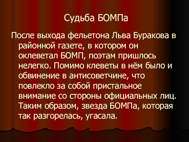 котором он оклеветал БОМП, поэтам пришлось нелегко. Помимо клеветы в нём было и обвинение в антисоветчине, что повлекло за собой пристальное внимание со стороны официальных лиц. Таким образом, звезда БОМПа, которая так разгорелась, угасала.