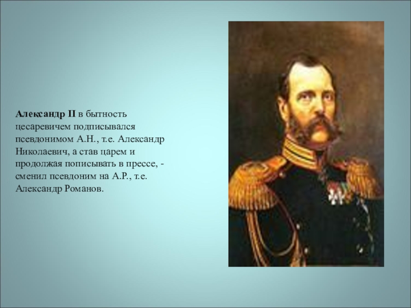 Слайд 8Александр II в бытность цесаревичем подписывался псевдонимом А.Н., т.е. Александр Николаевич,