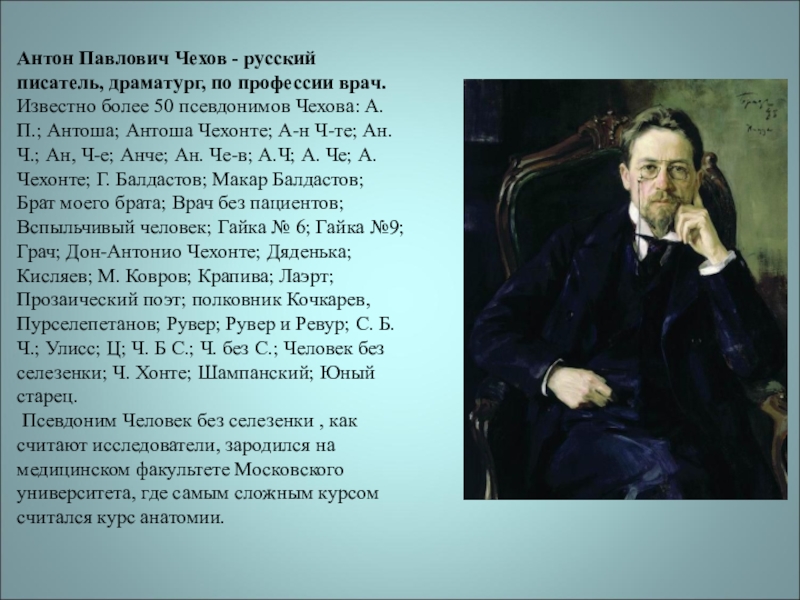 Слайд 12Антон Павлович Чехов - русский писатель, драматург, по профессии врач.