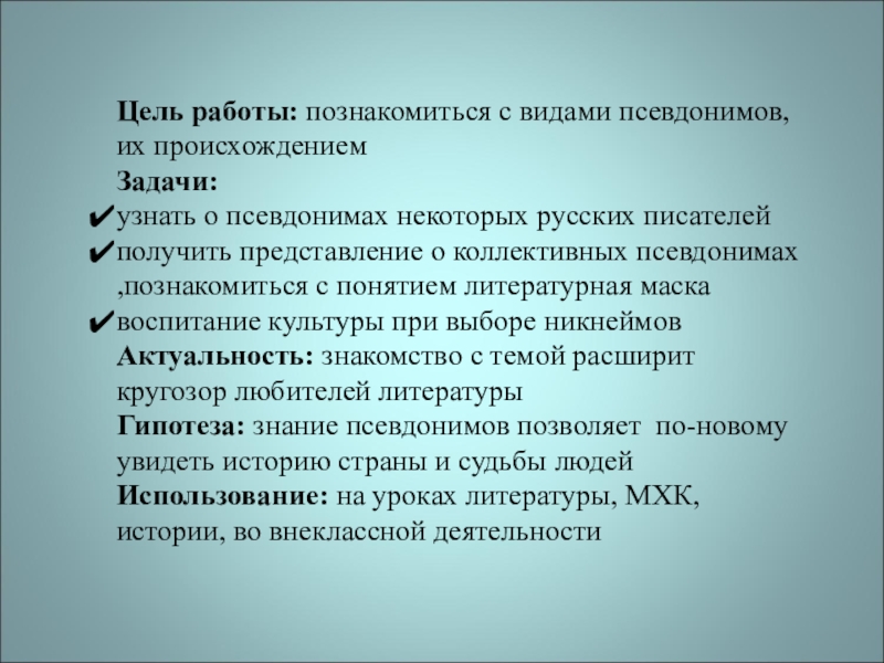 Слайд 2Цель работы: познакомиться с видами псевдонимов, их происхождением