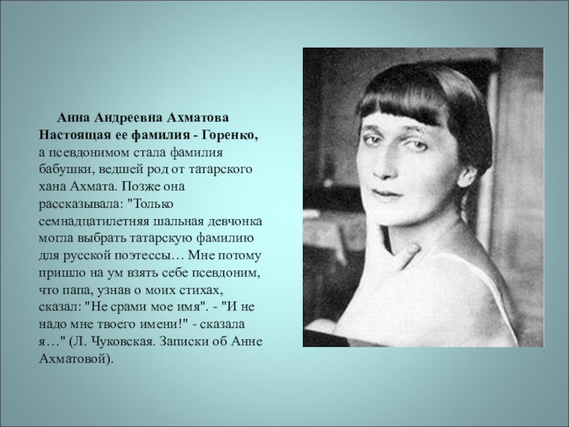 псевдонимом стала фамилия бабушки, ведшей род от татарского хана Ахмата. Позже она рассказывала: "Только семнадцатилетняя шальная девчонка могла выбрать татарскую фамилию для русской поэтессы… Мне потому пришло на ум взять себе псевдоним, что папа, узнав о моих стихах, сказал: "Не срами мое имя". - "И не надо мне твоего имени!" - сказала я…" (Л. Чуковская. Записки об Анне Ахматовой).