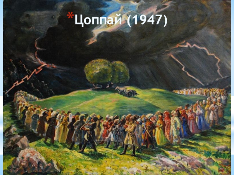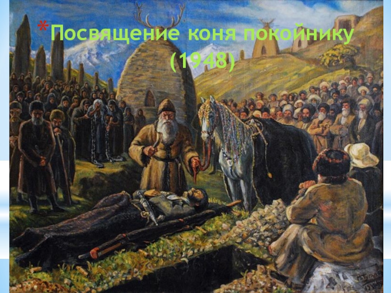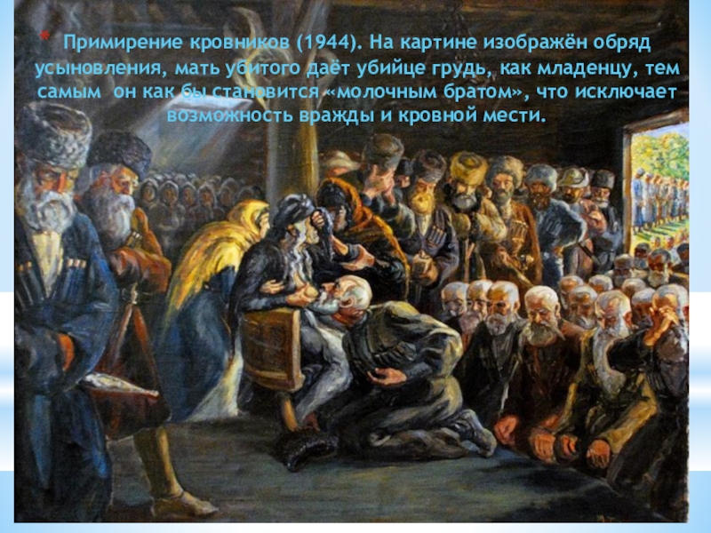 Слайд 25Примирение кровников (1944). На картине изображён обряд усыновления, мать убитого даёт