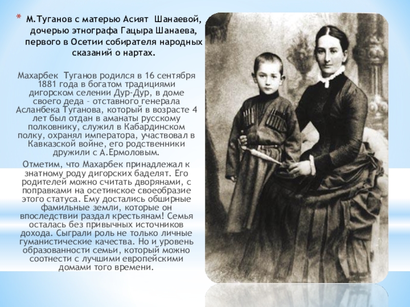 Слайд 4М.Туганов с матерью Асият Шанаевой, дочерью этнографа Гацыра Шанаева,первого в Осетии