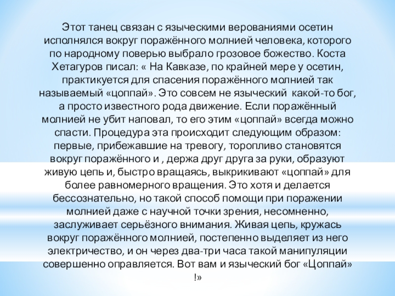 Слайд 30Этот танец связан с языческими верованиями осетин исполнялся вокруг поражённого молнией