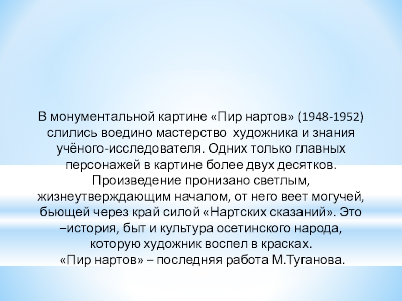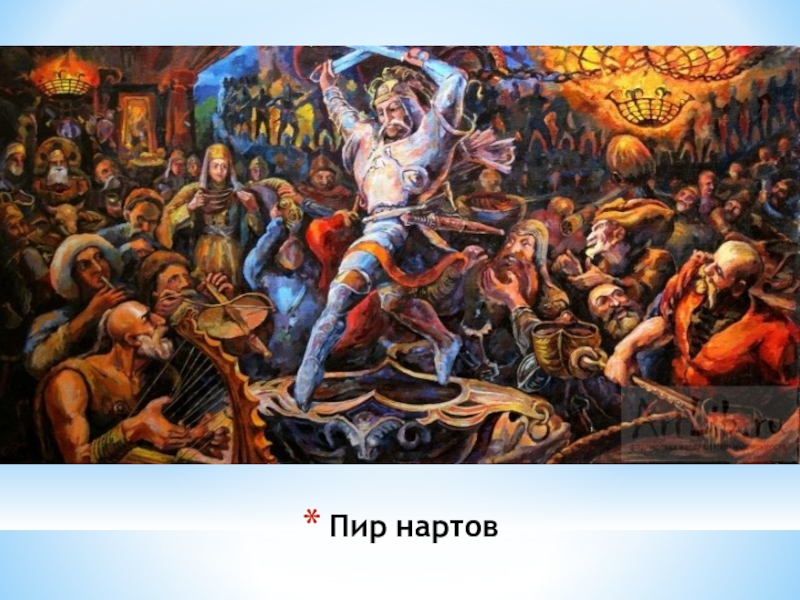 воедино мастерство художника и знания учёного-исследователя. Одних только главных персонажей в картине более двух десятков. Произведение пронизано светлым, жизнеутверждающим началом, от него веет могучей, бьющей через край силой «Нартских сказаний». Это –история, быт и культура осетинского народа, которую художник воспел в красках.