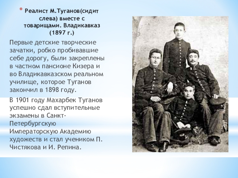 Слайд 11Реалист М.Туганов(сидит слева) вместе с товарищами. Владикавказ (1897 г.)
