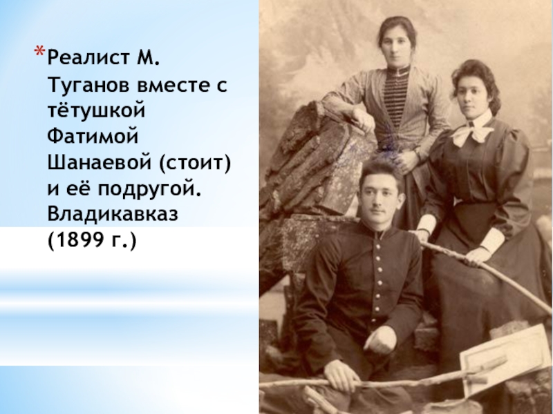 Слайд 9Реалист М.Туганов вместе с тётушкой Фатимой Шанаевой (стоит) и её подругой.