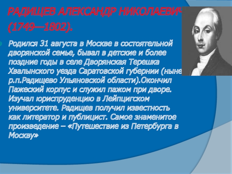 РАДИЩЕВ АЛЕКСАНДР НИКОЛАЕВИЧ (1749—1802).  Родился 31 августа в Москве в состоятельной дворянской семье, бывал в детские и