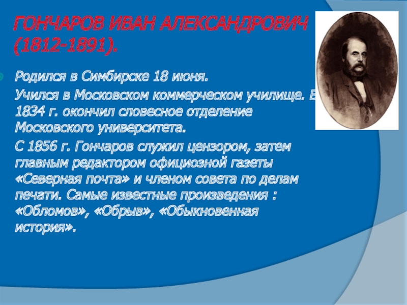ГОНЧАРОВ ИВАН АЛЕКСАНДРОВИЧ (1812-1891).Родился в Симбирске 18 июня. Учился в Московском коммерческом училище. В 1834 г. окончил словесное отделение Московского университета. С 1856 г. Гончаров служил цензором, затем главным редактором официозной газеты «Северная