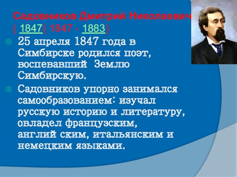 Садовников Дмитрий Николаевич ( 1847( 1847 - 1883)25 апреля 1847 года в Симбирске родился поэт, воспевавший Землю Симбирскую.Садовников
