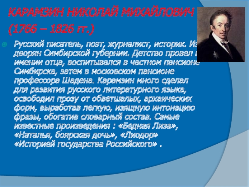 историк. Из дворян Симбирской губернии. Детство провел в имении отца, воспитывался в частном пансионе Симбирска, затем в московском пансионе профессора Шадена. Карамзин много сделал для развития русского литературного языка, освободил прозу от обветшалых, архаических форм, выработав легкую, изящную интонацию фразы, обогатив словарный состав. Самые известные произведения : «Бедная Лиза», «Наталья, боярская дочь», «Лиодор» «Историей государства Российского» .