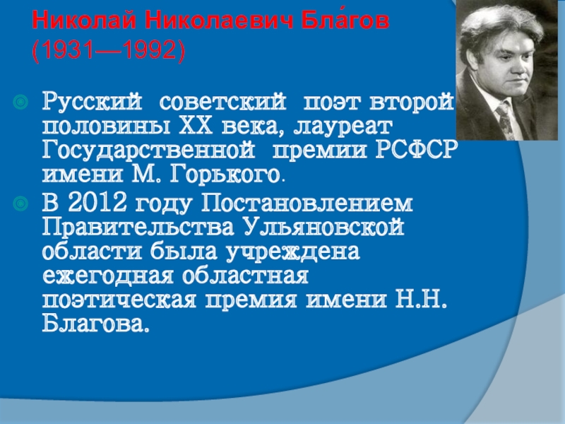 Николай Николаевич Бла́гов  (1931—1992)  Русский советский поэт второй половины ХХ века, лауреат Государственной премии РСФСР