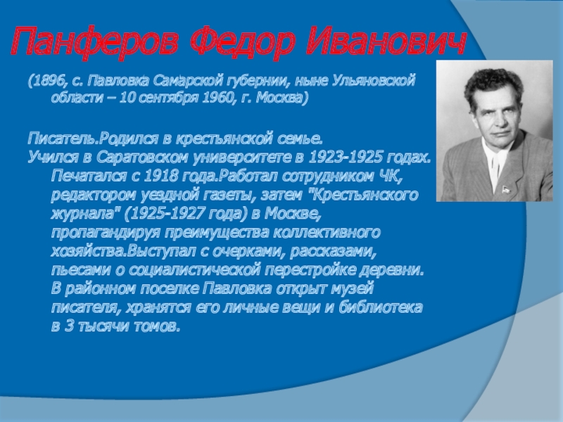 Панферов Федор Иванович(1896, с. Павловка Самарской губернии, ныне Ульяновской области – 10 сентября 1960, г. Москва)Писатель.Родился в