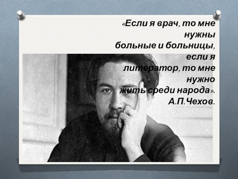 «Если я врач, то мне нужныбольные и больницы, если ялитератор, то мне нужножить среди народа».А.П.Чехов.