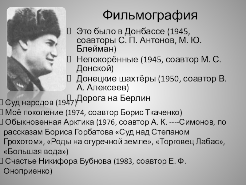 Обыкновенная Арктика (1976, соавтор А. К. ----Симонов, по рассказам Бориса Горбатова «Суд над Степаном Грохотом», «Роды на огуречной земле», «Торговец Лабас», «Большая вода»)