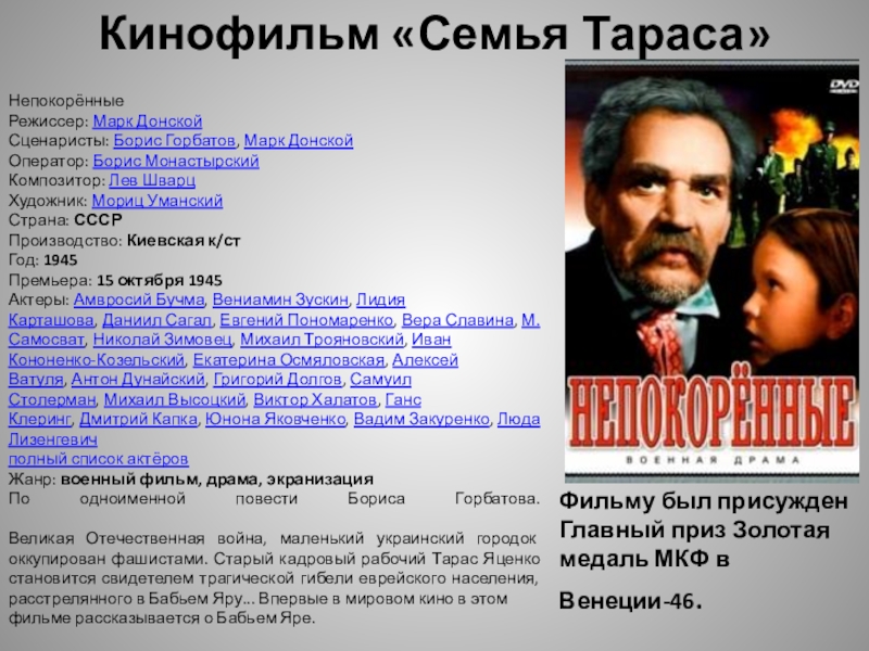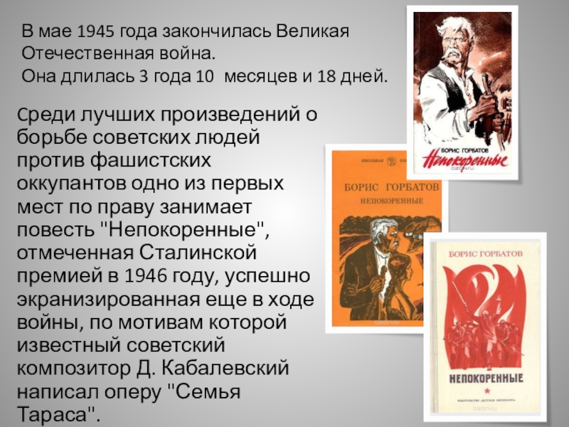 Cреди лучших произведений о борьбе советских людей против фашистских оккупантов одно из первых мест по праву занимает повесть "Непокоренные", отмеченная Сталинской премией в 1946 году, успешно экранизированная еще в ходе войны, по мотивам которой известный советский композитор Д. Кабалевский написал оперу "Семья Тараса".