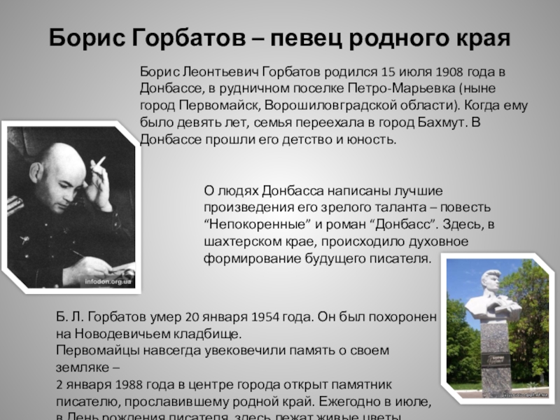О людях Донбасса написаны лучшие произведения его зрелого таланта – повесть “Непокоренные” и роман “Донбасс”. Здесь, в шахтерском крае, происходило духовное формирование будущего писателя.