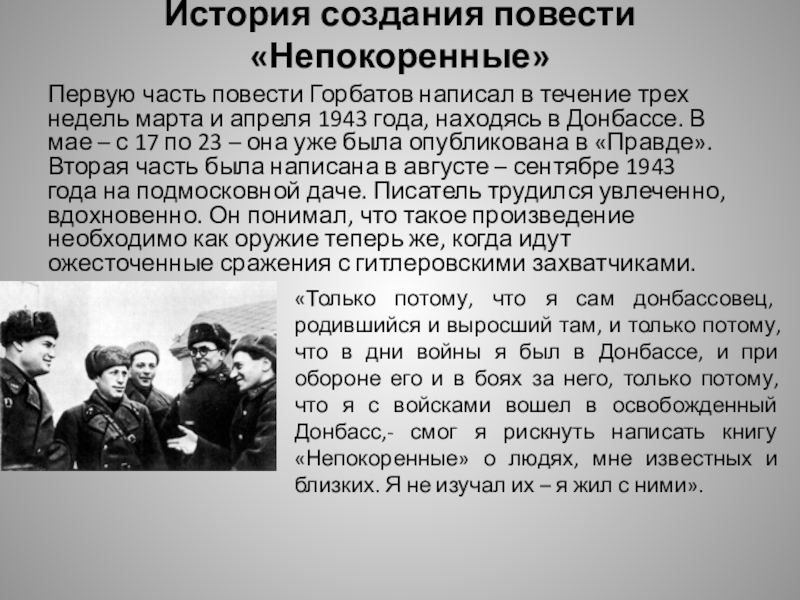 «Только потому, что я сам донбассовец, родившийся и выросший там, и только потому, что в дни войны я был в Донбассе, и при обороне его и в боях за него, только потому, что я с войсками вошел в освобожденный Донбасс,- смог я рискнуть написать книгу «Непокоренные» о людях, мне известных и близких. Я не изучал их – я жил с ними».
