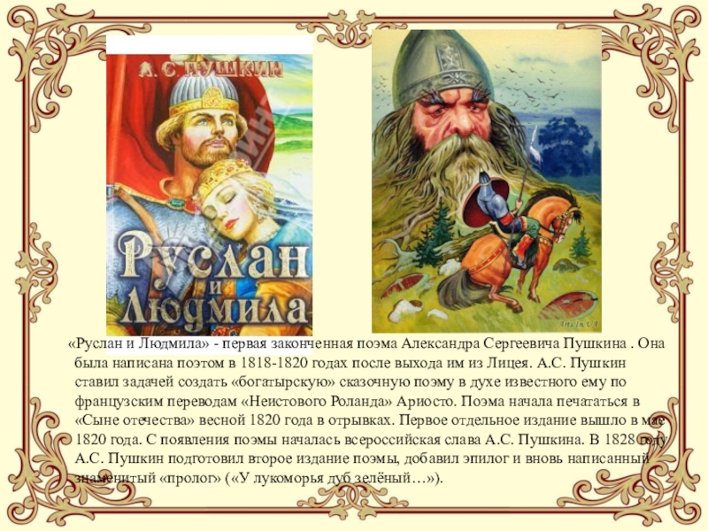 Сергеевича Пушкина . Она была написана поэтом в 1818-1820 годах после выхода им из Лицея. А.С. Пушкин ставил задачей создать «богатырскую» сказочную поэму в духе известного ему по французским переводам «Неистового Роланда» Ариосто. Поэма начала печататься в «Сыне отечества» весной 1820 года в отрывках. Первое отдельное издание вышло в мае 1820 года. С появления поэмы началась всероссийская слава А.С. Пушкина. В 1828 году А.С. Пушкин подготовил второе издание поэмы, добавил эпилог и вновь написанный знаменитый «пролог» («У лукоморья дуб зелёный…»).