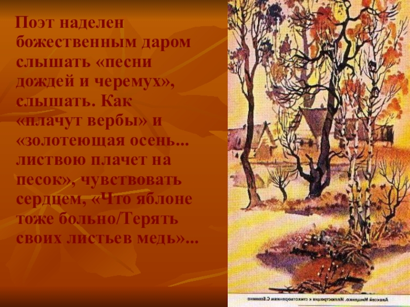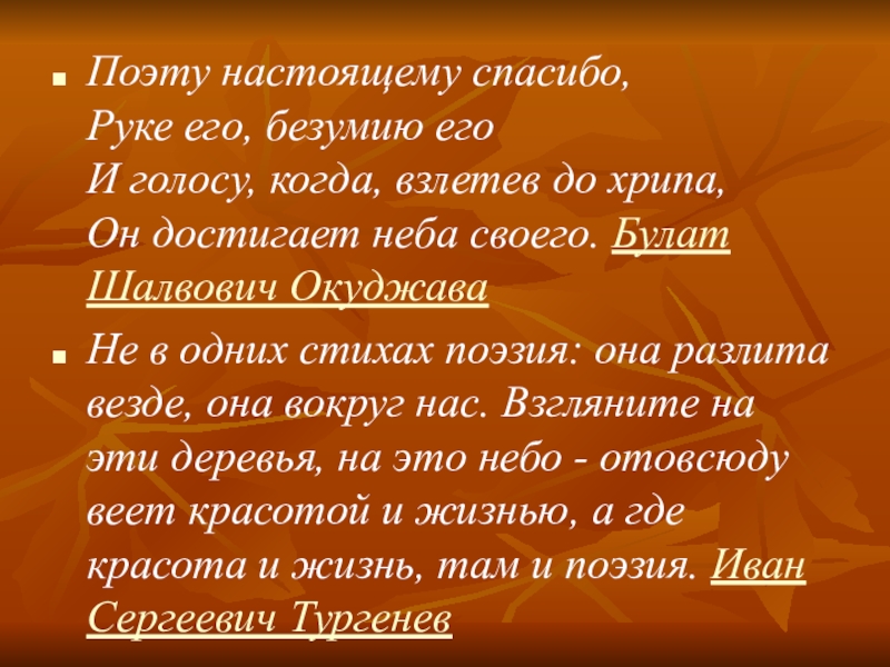 Не в одних стихах поэзия: она разлита везде, она вокруг нас. Взгляните на эти деревья, на это небо - отовсюду веет красотой и жизнью, а где красота и жизнь, там и поэзия. Иван Сергеевич Тургенев