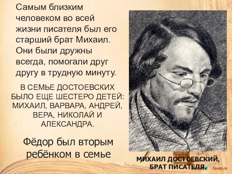 В СЕМЬЕ ДОСТОЕВСКИХ БЫЛО ЕЩЕ ШЕСТЕРО ДЕТЕЙ: МИХАИЛ, ВАРВАРА, АНДРЕЙ, ВЕРА, НИКОЛАЙ И АЛЕКСАНДРА.