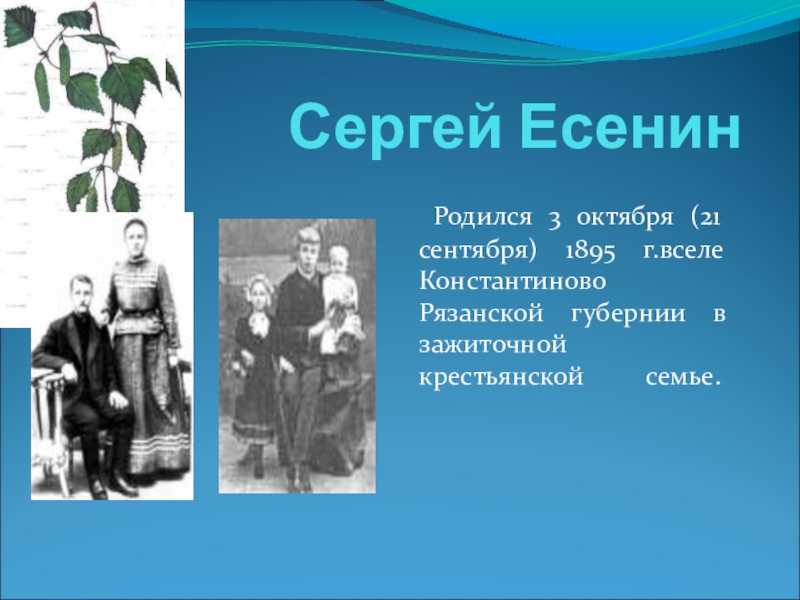 Сергей Есенин  Родился 3 октября (21 сентября) 1895 г.вселе Константиново Рязанской губернии в зажиточной крестьянской семье.