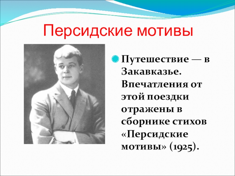 Персидские мотивыПутешествие — в Закавказье. Впечатления от этой поездки отражены в сборнике стихов «Персидские мотивы» (1925).