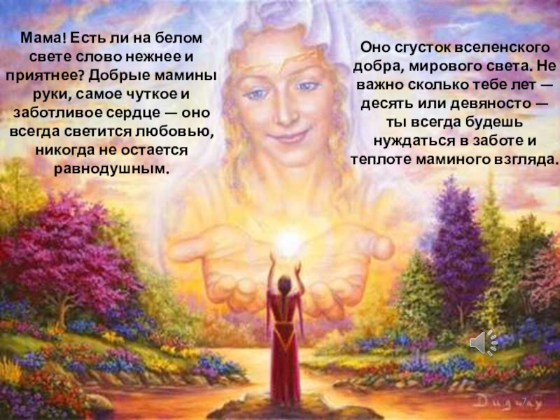 Оно сгусток вселенского добра, мирового света. Не важно сколько тебе лет — десять или девяносто — ты всегда будешь нуждаться в заботе и теплоте маминого взгляда.