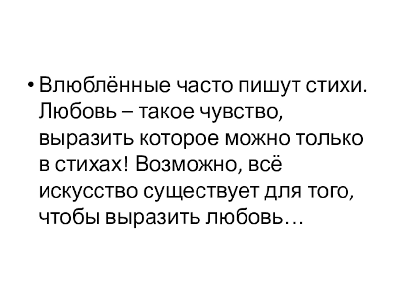 Слайд 2Влюблённые часто пишут стихи. Любовь – такое чувство, выразить которое можно