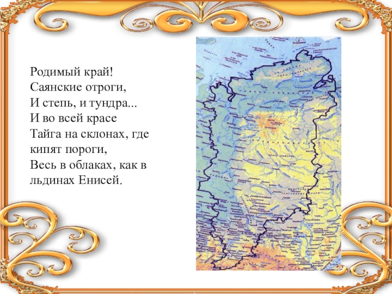 Слайд 2Родимый край!  Саянские отроги, И степь, и тундра...  И во всей красе  Тайга на склонах,