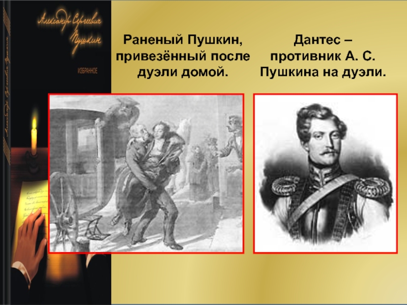 Дантес – противник А. С. Пушкина на дуэли.Раненый Пушкин,привезённый последуэли домой.