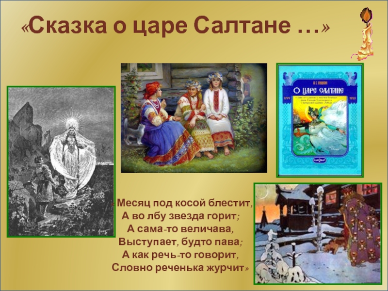 «Сказка о царе Салтане …»« Месяц под косой блестит,А во лбу звезда горит;А сама-то величава,Выступает, будто пава;А
