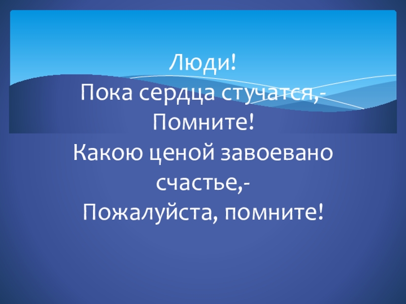 Слайд 44 Люди! Пока сердца стучатся,- Помните! Какою ценой завоевано счастье,- Пожалуйста, помните!