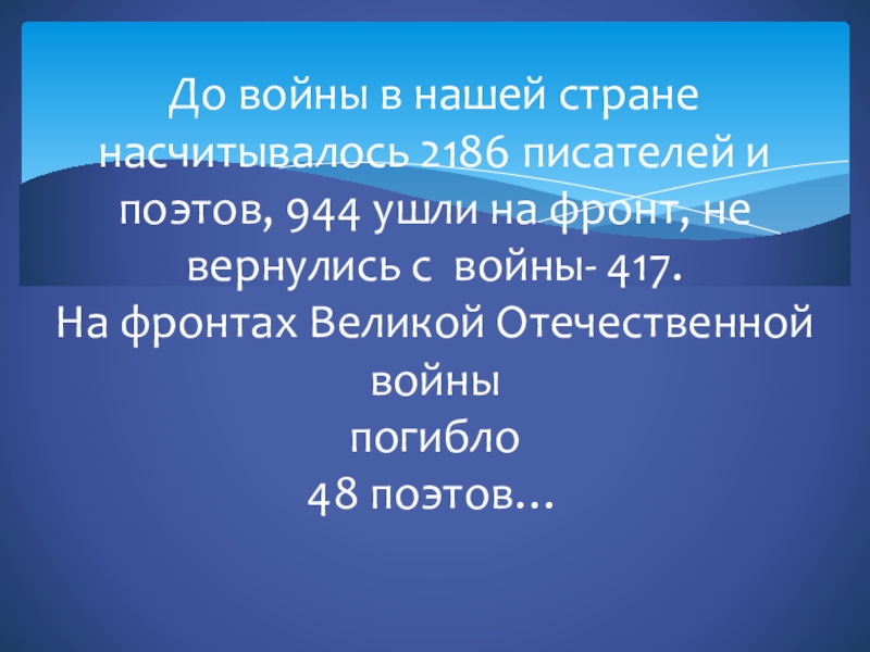 Слайд 5 До войны в нашей стране насчитывалось 2186 писателей и поэтов, 944