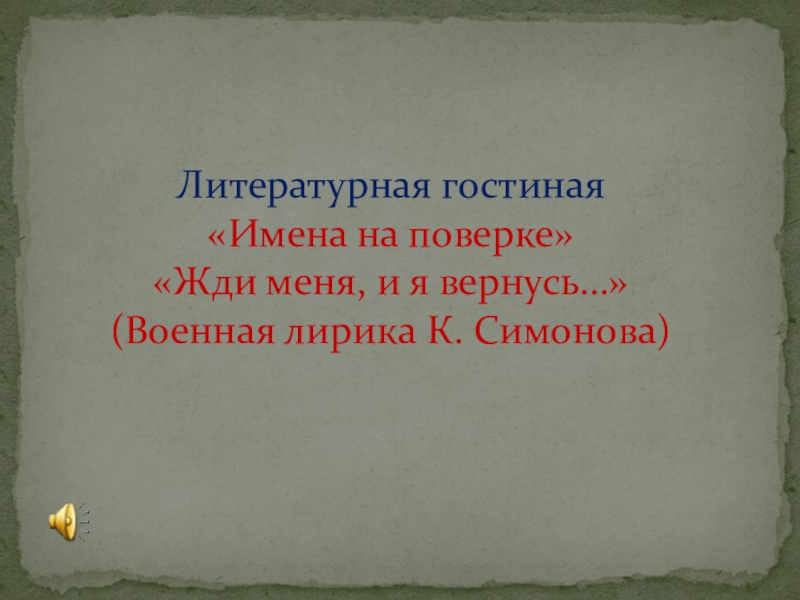 Слайд 1Литературная гостиная «Имена на поверке» «Жди меня, и я вернусь…» (Военная лирика К. Симонова)