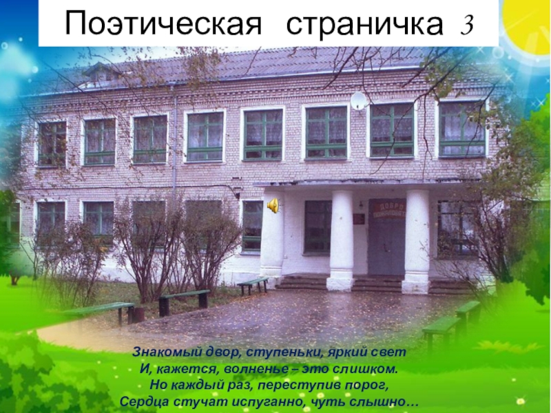 Знакомый двор, ступеньки, яркий светИ, кажется, волненье – это слишком.Но каждый раз, переступив порог,Сердца стучат испуганно, чуть
