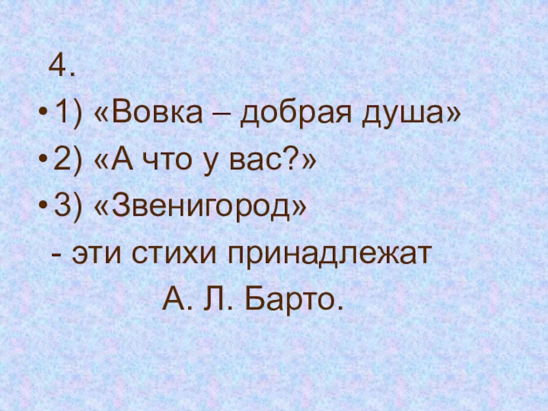 4.1) «Вовка – добрая душа»2) «А что у вас?»3) «Звенигород» - эти стихи принадлежат
